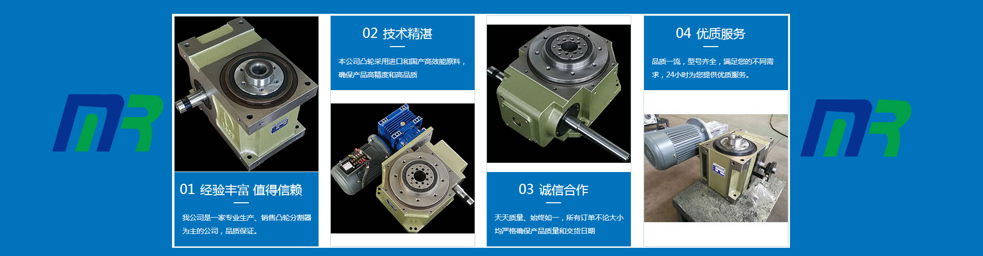 诸城市明润机械有限公司是专业从事高速精密凸轮间歇传动机构的研究、开发、制造的企业。专业生产各种型号规格的凸轮分割器、凸轮分度器、间歇分割器、分割器、凸轮间歇分度机构、平行箱、弧面箱等。公司以顾客需求为关注焦点,致力于顾客满意为己任,坚持与顾客互利的原则。 公司致力于以科研为先导,在产品设计上大力引进高新技术借助国内外同行的先进技术理念;在产品制造上不断引进国际最先进的加工、检测设备作质量保障,投入巨资购置四轴四联动加工中心、弧面凸轮磨削加工中心等专业生产设备。目前已将该类产品设定为MRH、MRP、MRY三大类别,八大系列,九十余种规格的产品,并可以按用户的不同要求,单独订做所需规格的产品。高速精密间歇分割器,具有分度精度高、高速性能好、运转平稳、传递扭距大,定位时自锁、结构紧凑、体积小、噪音低,寿命长等显著优点,是代替槽轮机构,棘轮机构、不完全齿轮机构等间歇机构的理想产品,其广泛应用于各种组合机构、玻璃陶瓷机械、烟草机械、灌装设备、机床加工中心、压力机自动送料机构、食品包装机械、制药机械、印刷机械、电子电器装配生产线、瓶盖设备等